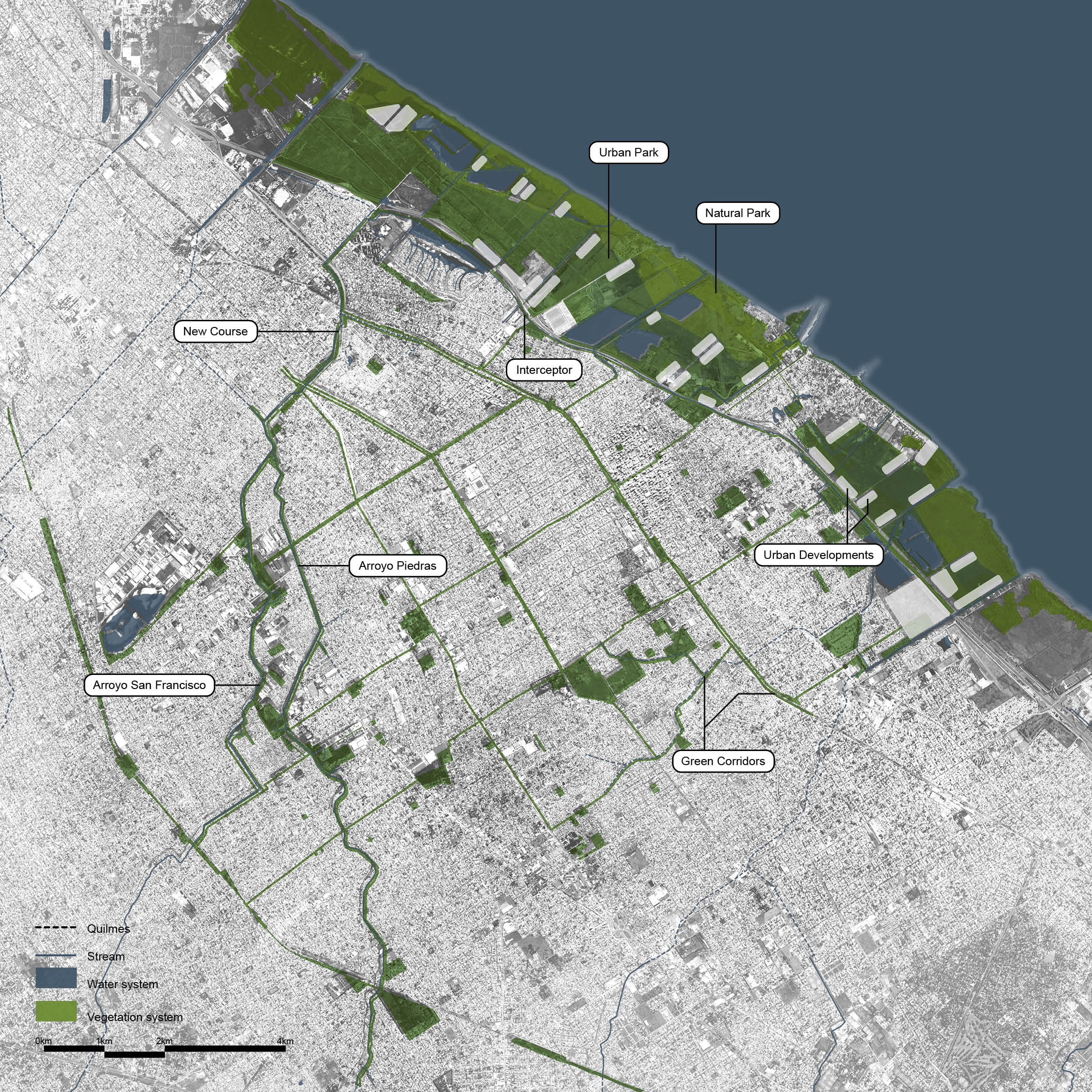 The improvement of water quality and the relation of citizenship with water courses serve as starting point to create a new system of public green spaces. The relation between the vegetation system and the hydrological system, the reorganization of the mobility system and consideration of a future careful development in the riverside composes a global vision for the city of Quilmes.